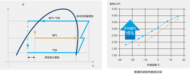EVI可提高制冷能力,系統(tǒng)制冷能效提高7%-10% ,制熱能效提高7%-20%,環(huán)境溫度越低,制熱COP提升幅度越大,降低壓縮機(jī)內(nèi)部運(yùn)轉(zhuǎn)溫度,大幅提升低溫環(huán)境下制熱的可靠性 ,EVI關(guān)閉時(shí)相當(dāng)于一段容量調(diào)節(jié),機(jī)組部分負(fù)荷性能表現(xiàn)更佳,300型機(jī)組采用雙壓機(jī)并聯(lián),每個(gè)壓縮機(jī)有單獨(dú)的補(bǔ)氣,機(jī)組控制更加精確,性能更加穩(wěn)定。與市場(chǎng)普通機(jī)組相比,制熱量平均提升15%以上