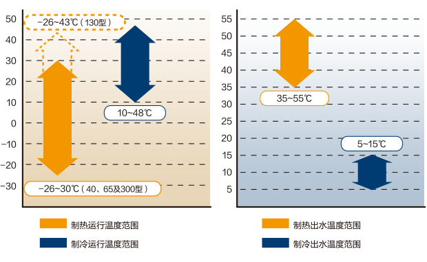 制熱運(yùn)行環(huán)境溫度:-26~30℃ (40、65及300型)、 -26~43℃(130型) 制冷運(yùn)行環(huán)境溫度:10~48℃ 制熱出水溫度:35~55℃ 制冷出水溫度:5~15℃