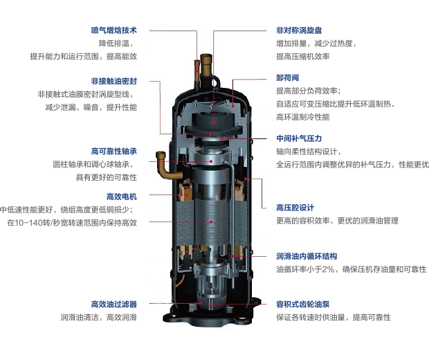 采用日立最新一代直流變頻的噴氣增焓渦旋壓縮機,在實現低溫制熱能力的同時,保證壓縮機運行的可靠與安全,大大提升整機運行的動力與能效,實現強勁制熱、節能安全的運行效果。全系列產品采用全變頻技術,即全部壓縮機采用高性能直流變頻噴氣增焓渦旋式壓縮機,室外機風扇電機采用直流變頻電機,給用戶帶來非凡的用戶體驗。