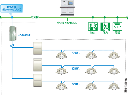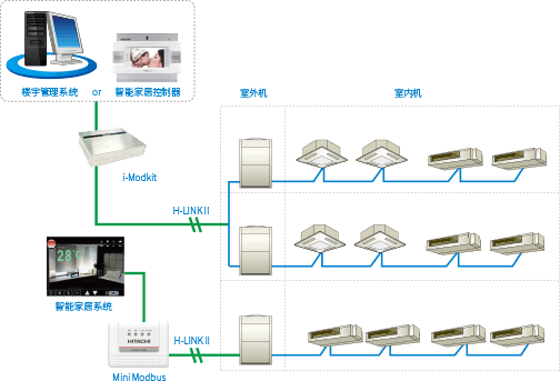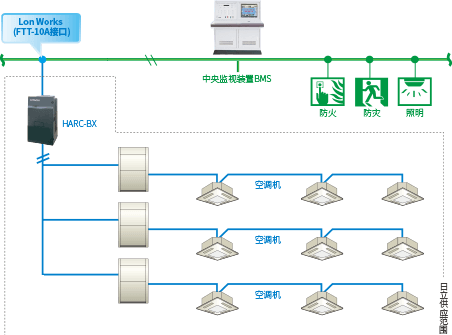 可以適用Lonworks、BACnet、MODBUS等多種網(wǎng)絡通信協(xié)議, 通過HARC-BX、HC-A64BNP或i-Modkit將空調設備接入樓宇自控或智能家居系統(tǒng), HARC-BX、HC-A64BNP和i-Modkit都可以連接64臺室內機