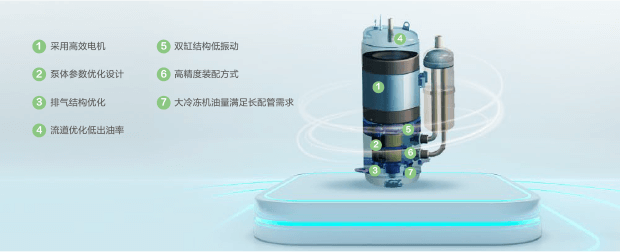 采用高效壓縮機(jī),效率高、出油率低,雙缸結(jié)構(gòu)低振動(dòng)噪音小,運(yùn)行穩(wěn)定可靠。