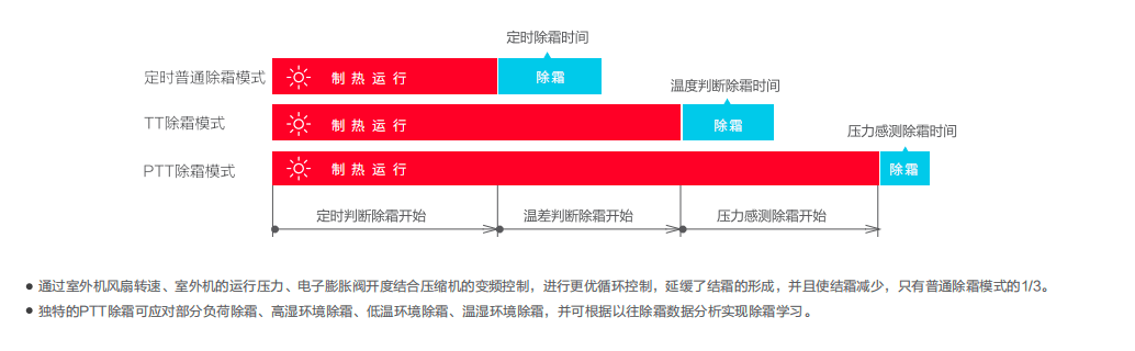 日立智能除霜模式采用日立獨特的壓力除霜模式(PTT除霜模式),通過分析溫度傳感器數據、壓力傳感器數據、部分負荷狀態、運行時間和上次除霜數據,精確除霜,冬季制熱運行時間大幅增加,除霜所需時間短,確保了冬季制熱效果。