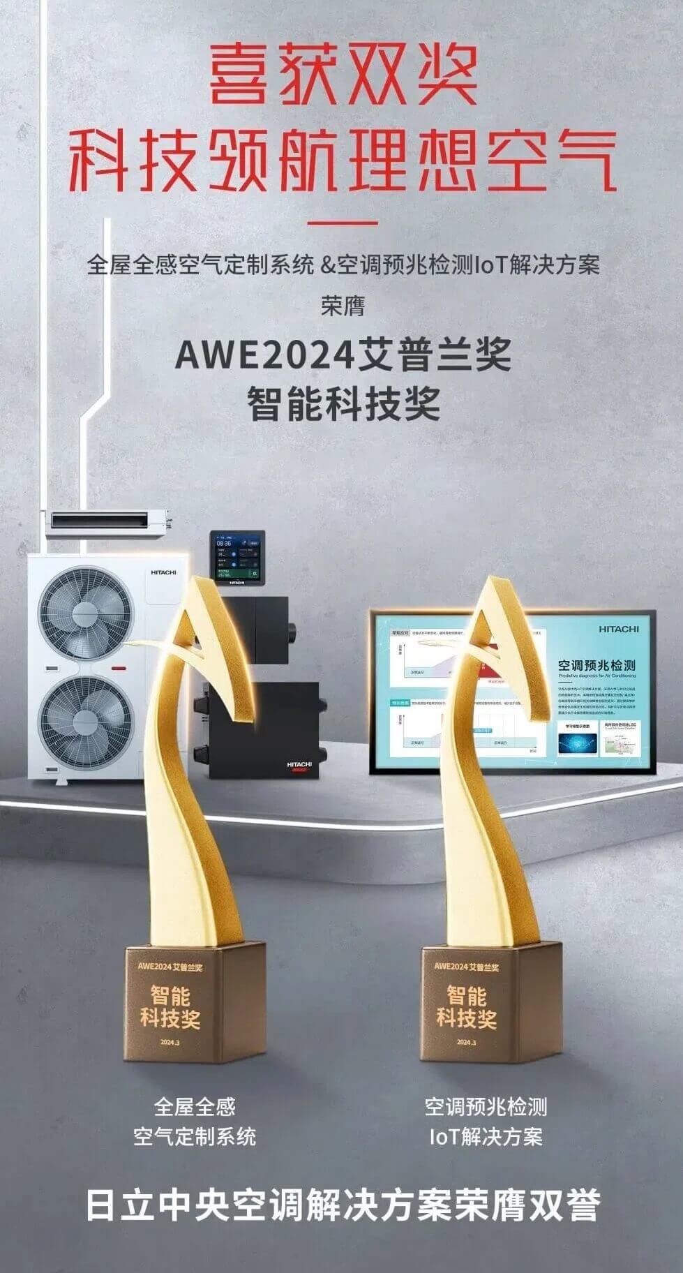 2024中國家電及消費電子博覽會(以下簡稱AWE2024)期間,日立中央空調以“科創先行 智引未來”為主題,不僅攜最新的空氣定制解決方案耀眼亮相,而且憑借領瞻的科技創新、產品實力及品質保障,摘攬艾普蘭獎兩項大獎,重磅推出的全屋全感空氣定制系統和空調預兆檢測IoT解決方案分別獲“智能科技獎”,充分彰顯了業內專家與消費者對領航實力的認可。