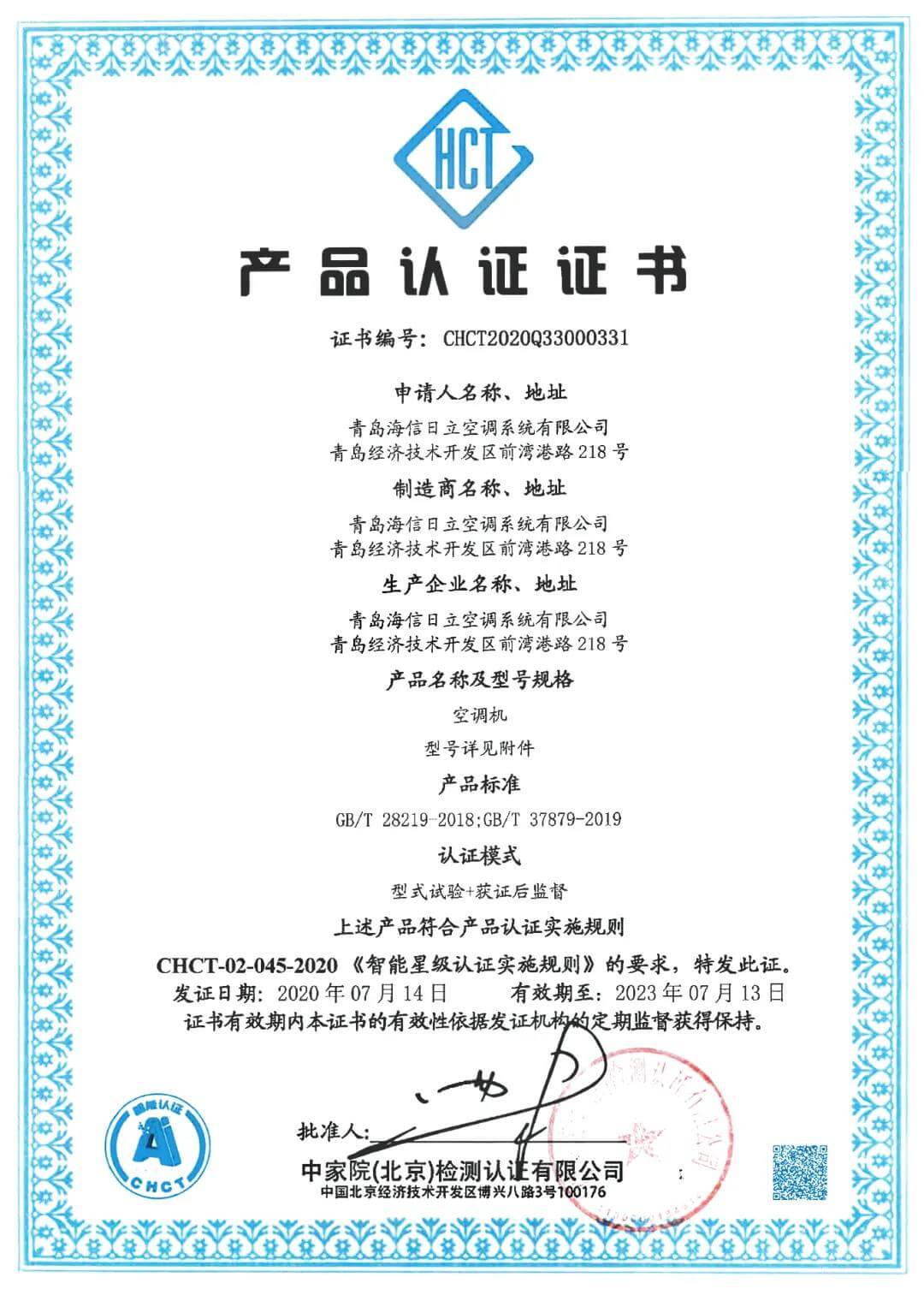 青島海信日立空調系統有限公司商品售后服務認證證書服務認證I型五星級(中國質量認證中心) 青島海信日立空調系統有限公司獲全國質量檢驗穩定合格產品(中國檢驗質量協會)