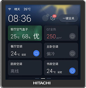 日立智慧屏進一步升級,可實現空調、地暖、新風、除濕、加濕系統一體化控制,也可獨立操控,高效便捷。系統間的聯動控制可實現自動化空氣管理,AI級智能調節,復雜系統簡單設定,一鍵運行,使用無憂。