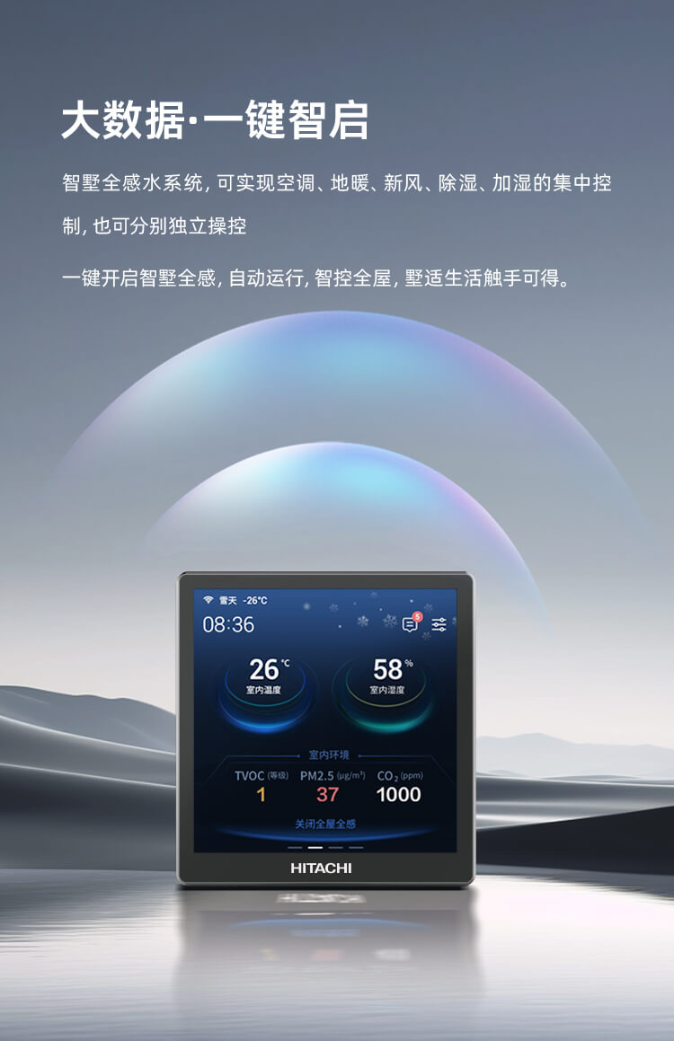 日立智慧屏進一步升級,可實現空調、地暖、新風、除濕、加濕系統一體化控制,也可獨立操控,高效便捷。系統間的聯動控制可實現自動化空氣管理,AI級智能調節,復雜系統簡單設定,一鍵運行,使用無憂。