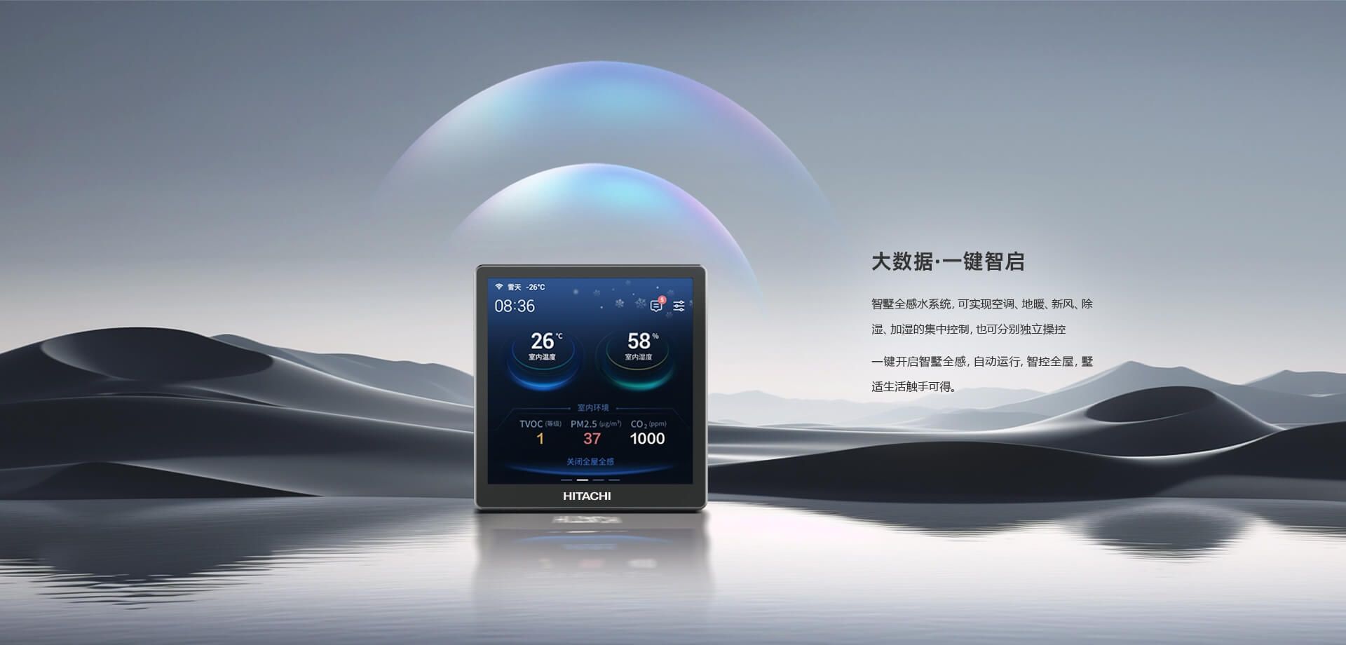 日立智慧屏進一步升級,可實現空調、地暖、新風、除濕、加濕系統一體化控制,也可獨立操控,高效便捷。系統間的聯動控制可實現自動化空氣管理,AI級智能調節,復雜系統簡單設定,一鍵運行,使用無憂。