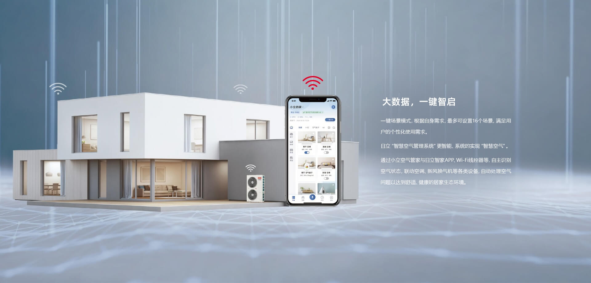 基于日立大數據模型AI技術,一鍵即可自動調節房間的溫度、濕度、新風,讓機組處于最佳運行狀態,節能提升8%以上。