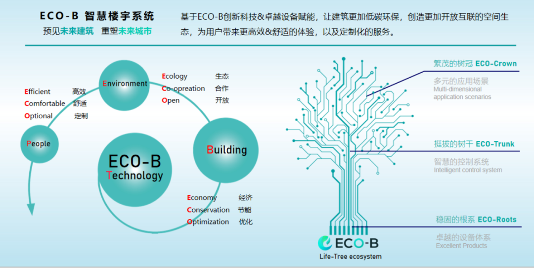 在具體場(chǎng)景應(yīng)用方面,ECO-B聚焦于建筑全生命周期各類人的需求,打造 ECO-B Air(空氣管理系統(tǒng))、ECO-B Energy(能源管理系統(tǒng))和ECO-B O&M(運(yùn)維管理系統(tǒng))3大管理系統(tǒng),覆蓋企業(yè)商業(yè)、政府公建、教育培訓(xùn)、醫(yī)療衛(wèi)生、工礦廠房等5大領(lǐng)域,延伸19大行業(yè)場(chǎng)景,讓建筑運(yùn)維更高效節(jié)能、讓空間設(shè)計(jì)更人性化、讓人的體驗(yàn)更舒適,全面推進(jìn)建筑從智慧到生態(tài)到健康轉(zhuǎn)變,塑造智慧、綠色、健康的未來(lái)城市空間,構(gòu)建人類&空間的綠色生命共同體。