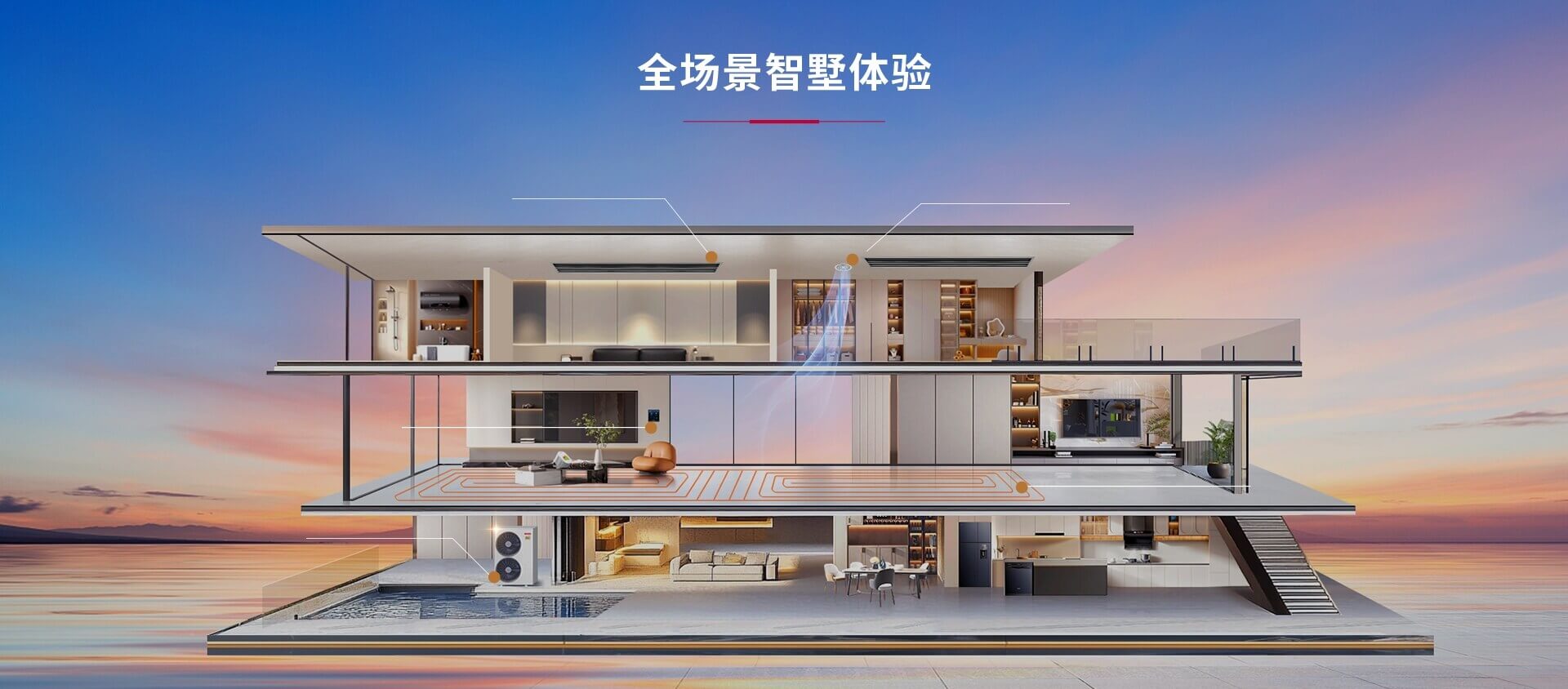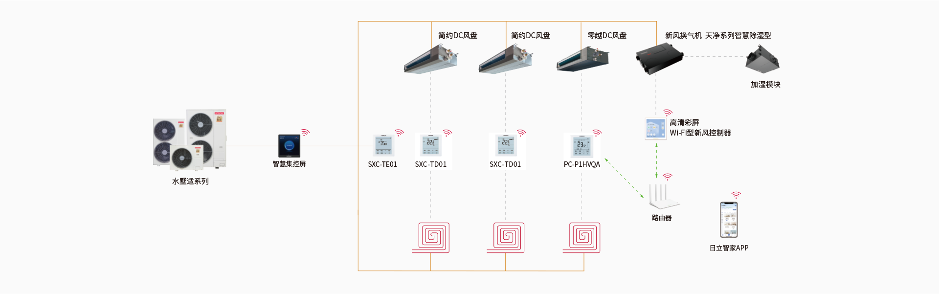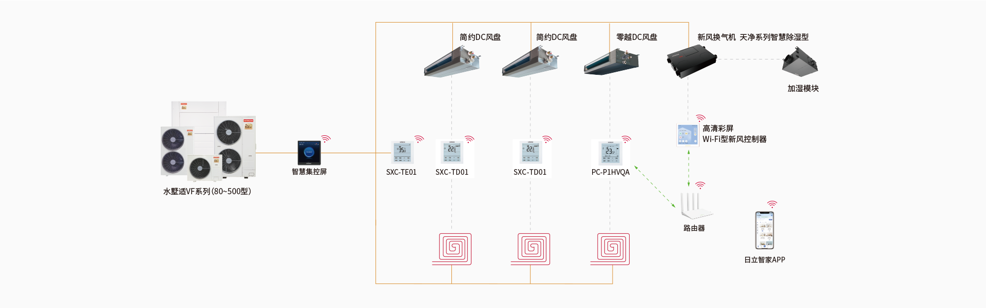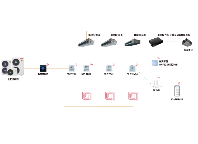 日立全屋全感2.0空氣定制系統將智控進一步升級,可實現空調、地暖、新風、除濕、加濕系統一體化控制,也可獨立操控,高效便捷。